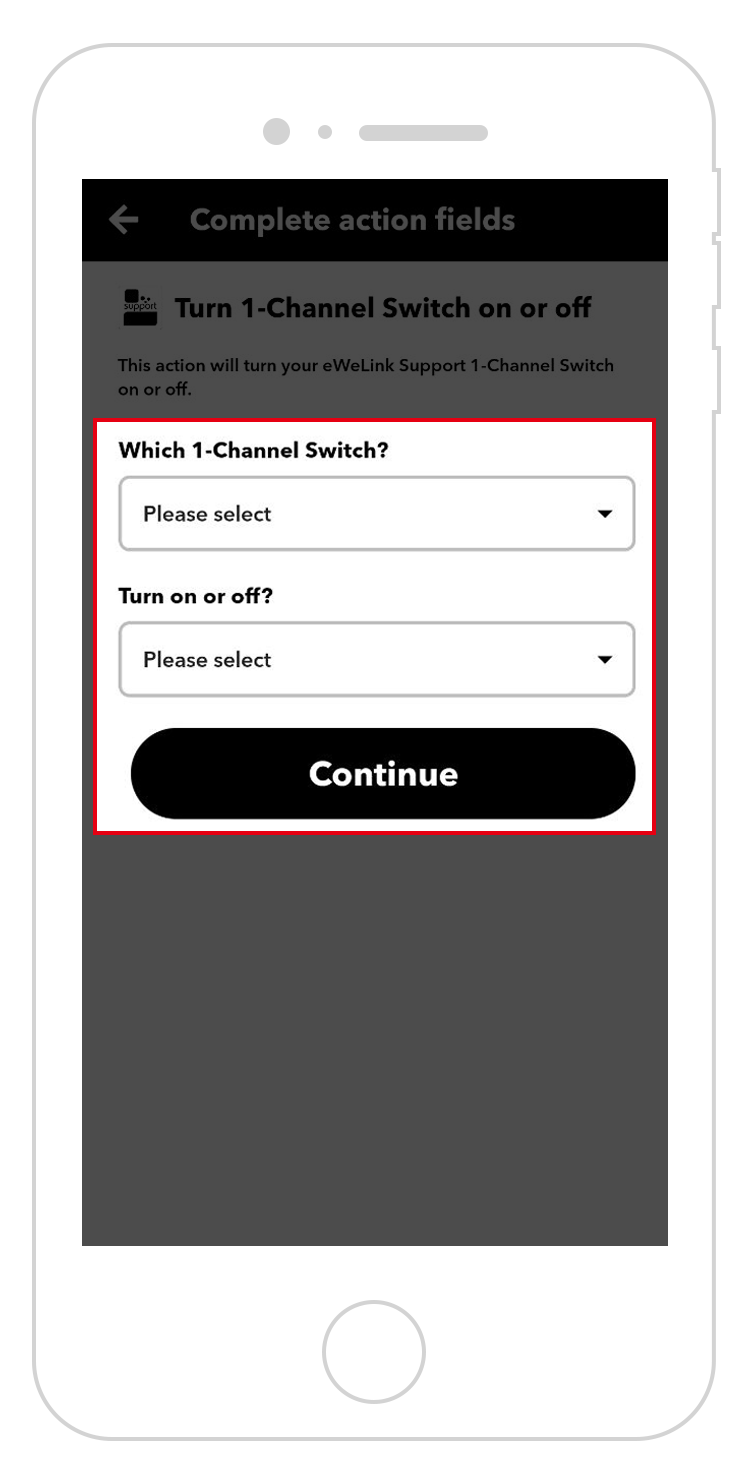 - Tap the downward triangle to select the name of the device and the action for the device to perform. In this example, the SONOFF MICRO is named socket and the action is to turn it on.